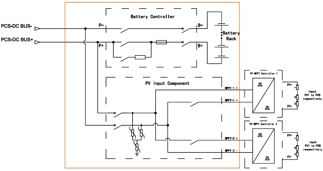 4.Ang sistema ng imbakan ng enerhiya ng baterya ay nagsasama ng isang pinag -isang interface ng input ng DC at kahon ng control ng baterya para sa awtomatikong pagkontrol sa photovoltaic MPPT upang maprotektahan ang singilin ng baterya.